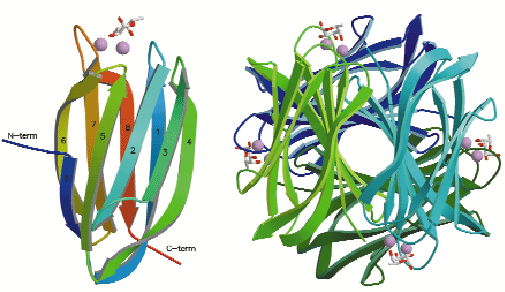 Fig. 10: Structure of the PA-IIL-fucose complex with stick representation of fucose and calcium ions as space-filling models: (left) Monomer with numbering of ß-strands in agreement with the greek-key motif (1 to 5); (right) The tetramer making up the asymmetric unit. |