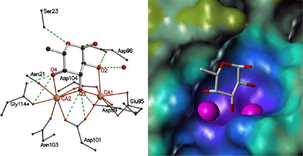 Fig. 11: Interactions of PA-IIL with calcium ions and fucose. (a) Stick representation of the amino acids involved in binding. Ca2+ coordination bonds are shown as solid orange lines; hydrogen bonds as dashed green lines. Colour coding: red, oxygen; blue, nitrogen; black, carbon; pink, Ca2+. (b) Electrostatic surface representation of the PA-IIL binding site with Ca2+ as large pink spheres and fucose as a stick model. |