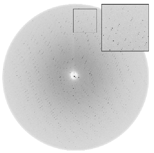 Fig. 14: An oscillation image (0.3°) from an I23 form CPMV crystal at 3.3 kbar ( |