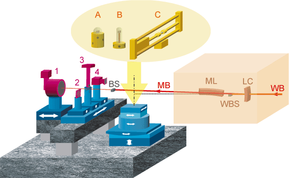 Fig. 76: Optics: WB: White beam; LC: Bent Laue crystal; ML: Bent multilayer; WBS: White beam stop; MB: 2-dimensionally micro-focussed monochromatic beam; BS: Monochromatic beam stop. Sample environment (yellow): A: Cryostat; B: Furnace; C: 25 kN stress rig. Detectors / slits (purple): 1: Large area detector; 2: Conical slit system; 3: High-resolution area detector; 4: Optional detector.