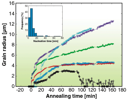 Fig. 77: Growth curves for 6 random grains are shown to illustrate the large spread in growth kinetics. The inset shows the distribution of nucleation times given a threshold of 1.3 µm.