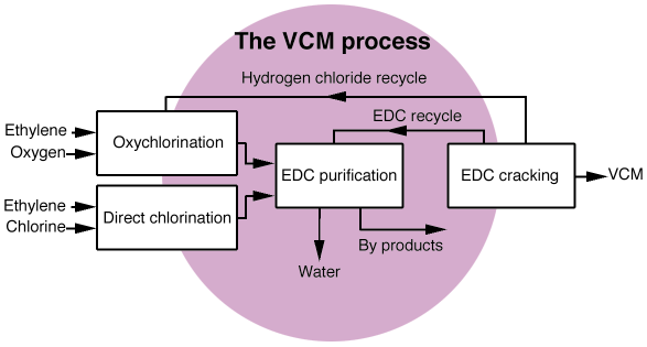 Nowadays, almost all the world's production of PVC (poly vinyl chloride) is obtained by the polymerisation of vinyl chloride (VCM), which is produced using C2H4, Cl2 and O2 as reagents, following the scheme represented in Figure 43. Production of VCM is based on the cracking of C2H4Cl2, which in its turn is produced by two parallel processes, direct chlorination: