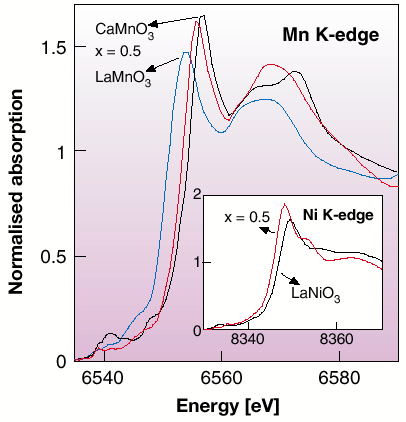 0.5) with the same Mn/Ni ratio and different oxygen content were also studied. The octahedron distortion is smaller in oxidised samples suggesting an increase in holes (oxidation) in the Mn sublattice. Opposite effects were observed in the local structure around the Ni atom. EXAFS shows that the Ni-O distance increases as the Mn content does. Figure 49 (Ni K-edge) displays the shift of the FT first peak toward higher values for the x = 0.5 sample. No changes were observed in the Ni environment in oxidised samples. Therefore, a contraction of the MnO6 octahedron is coupled to an expansion of the NiO6 octahedron. This result is well correlated with the changes in the oxidation states deduced from XANES. The Mn valence state continuously changes from the formal 3+ state in LaMnO3 to a nearly 4+ state in LaNi0.5Mn0.5O3. Thus, the energy position of the absorption edge for LaNi0.5Mn0.5O3 is close to the position for CaMnO3 with formal 4+ state (Figure 50). The Ni valence state instead shifts from Ni3+ in LaNiO3 to Ni2+ in LaNi0.5Mn0.5O3 (inset of Figure 50). Therefore, Ni2+ and Mn4+ are the most suitable ionic approximation for LaNi0.5Mn0.5O3+