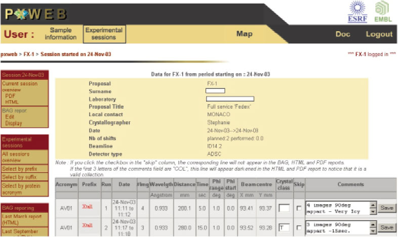 Several tools for automation of the crystallography beamlines have been implemented over the last two years (see 'Further steps towards beamline automation' for more details). MXpress has been used as the test bench for some of these tools and has encouraged development of the others. PXweb (Figure 146), our beamlines Laboratory Information Management (LIM) system, is intimately linked to the MXpress service since it allows on-line reporting of the current experiment. As it is a Web service, users can provide ESRF staff with an exhaustive description of the dewar contents and follow the experiment being carried out in real time. During data collection they can retrieve their data through the internet and interact with the staff present on-site and so modify the experiment's progress. Other very recent tools are the automatic sample centring software from EMBL Grenoble currently available on ID14-3, and the DNA software for automated data collection and processing currently available on all ESRF MX beamlines. This software uses two reference diffraction patterns to deduce the crystal orientation in the beam and propose a data collection strategy. Finally the EMBL-ESRF sample changer has been available on ID14-3 since December 2003 and will be installed on the other beamlines starting mid 2004.