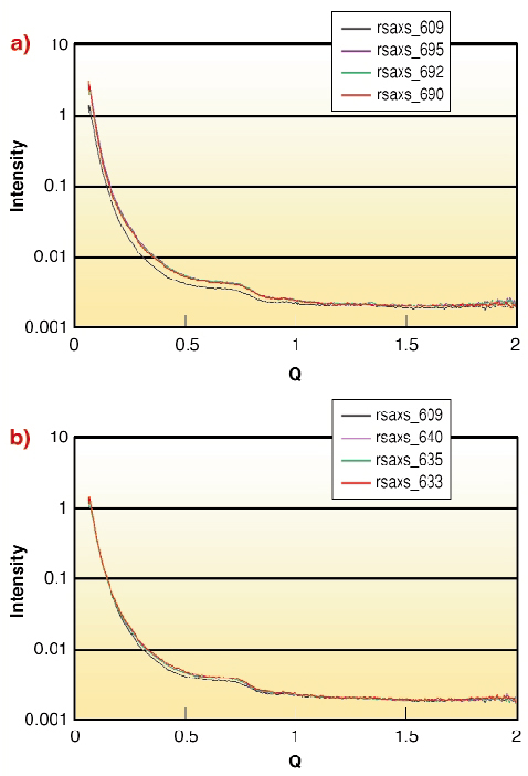Hair care is an important part of Unilever's Home and Personal Care business. The physical appearance of hair is closely correlated to its microstructure, and although the microstructure of hair is well known [1], the fine detail of its control has eluded us because of the considerable natural variation within the hair itself. We have developed a method using the ID02 high-brilliance beamline to combat this natural variation and furthermore permit quantification of the change in microstructure as a consequence of some physical or chemical perturbation, essentially using the hair as its own control. Figure 147a shows the small-angle scattering from a single hair fibre. Each image represents the scattering from the hair at nine points along the fibre separated by 0.5 mm. The radial average of this data is shown in Figure 147b and this demonstrates the reproducibility obtainable within a single fibre itself.