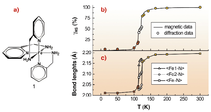 Fig. 49: (a) Iron(II) tris-2-picolylamine complex [Fe||(2-pic)3]2+. (b) Comparison of spin transition behaviour from diffraction and magnetisation experiments. The HS fraction |
