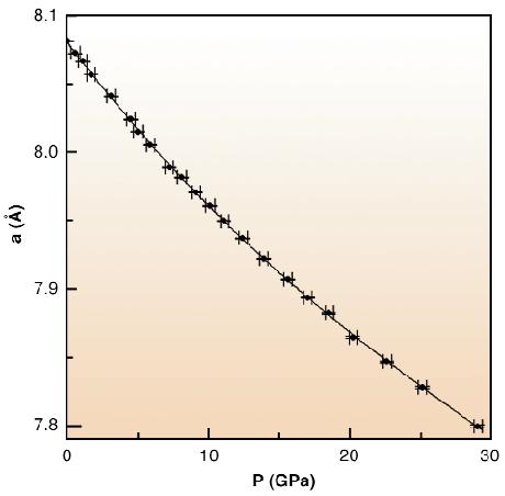 The MgAl2O4 sample used in the present investigation was synthesised by a high-temperature solid state reaction of MgO and Al2O3. The high-pressure powder diffraction experiments were carried out on the ID09A beamline using a diamond-anvil cell, with N2 as a pressure-transmitting medium; pressure was estimated by the fluorescence line shift of ruby. The diffraction patterns were treated by the Rietveld method (GSAS-Expgui software), and provided the cell edge (a) (see Figure 57), the oxygen coordinate (u) and the atomic displacement parameters. The elastic parameters (bulk modulus, K0, its first and second derivatives vs P, K'0 and K"0, respectively) were determined by fitting different EoS models to the observed pressures (Birch-Murneghan (BM), Vinet (V) and Poirier-Tarantola (PT)). An comparison between the issues of the different EoS's suggests one to choose the results from the 3rd order BM, yielding the following elastic parameters: K0 = 191(1) GPa, K'0 = 6.7(2) and K''0 = -0.075 GPa-1 (implied value).