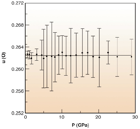 The structure of spinels is fully described by the one independent coordinate of oxygen, u, displayed in Figure 58 as a function of P. Save statistical oscillations, u exhibits a practically flat trend; if a linear function, u0+u1P, is fitted to the observed u's one obtains u0 = 0.2625(1) and u1 = 0.9(8.9) 10-6 GPa-1. This indicates that the structural behaviour under compression of MgAl-spinel is mainly governed by the shrinking of the cell edge and P acts upon MgAl2O4 producing a scaling of the structure.