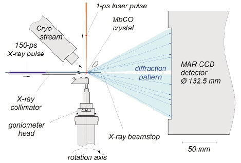 Fig. 60: Experimental setup used to acquire picosecond time-resolved X-ray diffraction data. The crystal is photolysed by a laser pulse and then probed by a time delayed X-ray pulse, whose diffraction pattern is recorded by an area detector. A cooling stream allows the flash photolysis to be repeated at 3.3 Hz. The orientation of the sample is fixed during each exposure; the goniometer spindle rotated between exposures. The 200 µm crystal is mounted in a sealed X-ray capillary. |