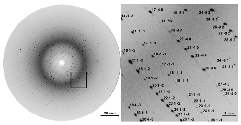 Fig. 61: One of 155 time-resolved Laue diffraction images recorded from a single crystal. This image contains about 3000 diffraction spots. Only a small fraction of these spots would appear when probed with monochromatic X-ray radiation. The enlarged view identifies Miller indices associated with the crystallographic planes that generated the Bragg reflections. This exposure represents the diffracted intensity from 32 X-ray pulses with the laser-to-X-ray delay set to 100 ps, accumulated over 10 seconds. |