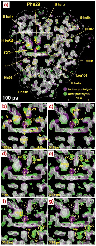 Fig. 62: 1.8 Å resolution electron density maps determined at from Laue diffraction data. For clarity, the electron density shown is confined to a 6.5 Å slab through the heme. The photolysed maps are coloured green and the unphotolysed maps are coloured magenta. Where both densities overlap, they blend to white. A white stick model of the unphotolysed structure is included to guide the eye. The direction of molecular motion follows the magenta to green colour gradient. (a) Three large scale displacements near the CO-binding site (large arrows) are accompanied by more subtle correlated rearrangements throughout the entire protein (small arrows; not drawn to scale). (b-g) Enlarged views of the boxed region in panel (a) at time delays specified in the lower left of each panel. (b) Upon photolysis, the bound CO (magenta; site 0) dissociates and becomes trapped approximately 2 Å away in a docking site (green; site 1), close to the Phe29. To accommodate the "docked" CO, the Phe29 is displaced and rotates, pushing His64 outward, which in turn dislodges a bound surface water molecule (magenta). (c-e) From 316 ps to 3.16 ns, the structural changes are largely confined to the vicinity of the binding site. As the CO migrates from site 1 to site 3 (Xe4), the Phe29 and His64 relax toward their deoxy conformations, which are similar to their unphotolysed states. (f-g) By 31.6 ns, CO has migrated to sites 4 and 5, where it remains trapped out to the microsecond time scale. The magenta and green maps were contoured at the same absolute level (1.5 |