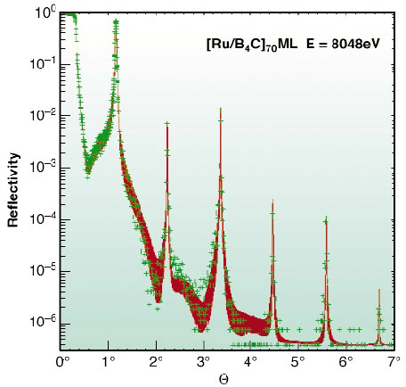 Fig. 167: Measured specular reflectivity versus incidence angle (crosses) and numerical simulation (red curve) of a Ru/B4C multilayer. |