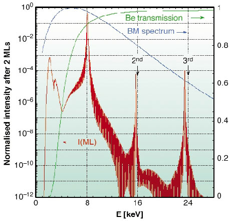 Fig. 168: Estimated intensity versus energy after two multilayer reflections (red curve) on a logarithmic scale, taking into account the bending magnet source spectrum (blue curve) and the transmission through all Be windows (green curve), shown on a linear scale. |