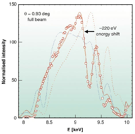 Following this idea, a double-graded focusing multilayer mirror with a length of 270 mm and a focal distance of 285 mm was designed and fabricated at the ESRF Multilayer Laboratory. Based on a W/B4C coating, it should provide a constant reflectivity of 50% in a bandwidth of 9% about a mean energy of 9 keV. Focusing experiments were carried out at APS on the undulator beamline 7ID. The focal line was recorded with a CCD camera while varying the photon energy of the incoming beam. The measured line width remained stable at about 8 µm, mostly limited by the figure error of the bent substrate. The total intensity is plotted in Figure 170 as a function of the photon energy. The experimental data (circles) differ considerably from the ideal prediction (dashed line). However, after inclusion of attenuation and alignment corrections, a good simulation of the data is possible (solid line). We are currently developing a device to be installed at ESRF beamlines.