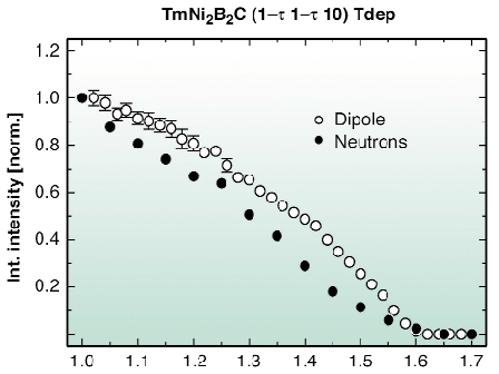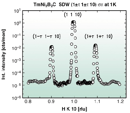 10) spin density wave satellites, at T = 1 K, together with the (1 1 10) Bragg intensity are shown in Figure 171. Polarisation analysis was used to measure the s component of the scattered intensity (i.e. the component of the incident s photons scattered with a