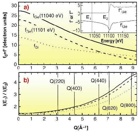 Ge islands on Si have been the subjects of numerous studies. Such islands show interesting morphological shape transitions as a function of growth parameters. From a series of studies, it is known that intermixing in such islands exists, but difficulties in the quantification of the composition profile along the growth direction remain. This profile, together with the strain distribution is of fundamental importance for the electronic band structure of embedded islands and thus for any application. Anomalous X-ray diffraction close to absorption edges can indeed be used to obtain the necessary chemical sensitivity for a direct determination of composition profiles in SiGe islands. In general, the energy and momentum dependency of the atomic scattering factor is expressed by f(Q,E) = f0(Q) + f'(E)+if"(E). With f'(E) and f"(E) being the energy-dependent correction that becomes important close to an absorption edge. f0 equals the total number of electrons Z for forward scattering, but decreases for higher momentum transfer Q. Thus the anomalous scattering effects can be enhanced considerably by measuring Bragg reflections for high momentum transfers as shown in Figure 89, since f'(E) and f"(E) remain constant with Q. Evaluating the intensity ratio for the two energies E1 and E2 (inset in Figure 89a) at a given momentum transfer Q, one can link composition and lattice parameter without any model assumptions. To demonstrate the method, a SiGe island sample grown by molecular beam epitaxy on Si(001) has been investigated.