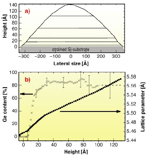 At a substrate temperature of 600ºC, seven monolayers of Ge were deposited, leading to islands with a height of about 140 Å and a width at the base of about 700 Å. From the intensity ratios I(E1)/I(E2) of the most sensitive reflections (620) and (800) the composition for a certain lattice parameter is directly extracted. A region with vanishing Ge-content exhibiting tensile strain with respect to the substrate is clearly visible. This can be attributed to the strained region in the Si-substrate below the Ge-island. In a second step, we recorded line-scans perpendicular to the radial scan direction. These angular scans are sensitive to the lateral size of a region with fixed lattice parameter. Using the cross-section profile of the islands from atomic force microscopy, the lateral size can be associated with a certain height within the islands (see horizontal lines in Figure 90a), linking the height with the in-plane momentum transfer Q. Combining all results we can finally reconstruct the Ge-concentration as a function of the height in the island. The result is shown in Figure 90b. The figure clearly shows a rather abrupt interface between Si and the SiGe-island, with an almost constant Ge content of roughly 80% above a height of 20 Å.
