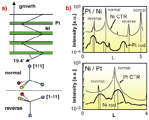 Fig. 93: (a) Schematics of the stacking sequence of the FCC (111) planes in a Pt-Ni multilayer. The [1-11] direction does a "zig-zag" when going from one layer to the next. This sequence gives a hexagonal symmetry to the multilayer, which, combined with the full magnetisation of very thin Pt layers, leads to perpendicular magnetic anisotropy. (b) Surface diffraction data showing the stacking conservation for Ni on Pt(111) and the stacking reversal for Pt on Ni (111). The comparison of the substrate and film diffraction rods enables are comparison of the stackings (ABC or ACB) of the substrate and the film, since the Bragg peaks for the two stacking appear at different L's on this rod. |