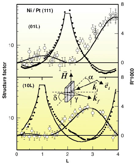 Fig. 94: Standard truncation rods of the Pt substrate (filled circles) and corresponding magnetic rods (open circles), for a 8 layer Ni film on Pt(111). The magnetic rods are obtained by measuring, at each L, the diffracted intensity for two directions of the applied magnetic field (pointing up, or pointing down), and forming the asymmetry ratio R(HKL)= (I |