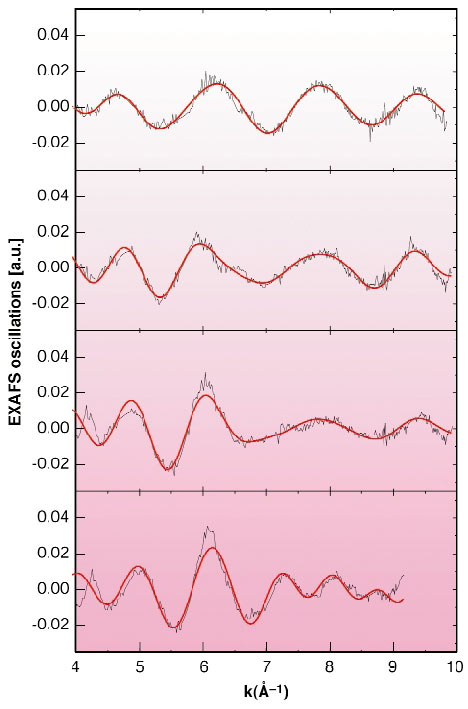 The diatomic molecule can be considered as the most simple condensed-matter object. In spite of this simplicity, it still reserves many hidden surprises [1]. When diatomic molecules are brought together they can form perfectly arranged structures called molecular crystals. The main characteristic of this class of crystals is that the molecule is preserved and the intra-molecular distance is much smaller than any other interatomic distance within the crystal. Among the molecular crystals, bromine is one of the simplest and is constituted of weakly interacting layers of zig-zag Br2 molecules. The other halogens (I2 and Cl2) share the same crystal structure. What happens when we try to compress this crystal? The best known part of the play is the last act: at a given point the inter-molecular distance becomes comparable to the dimer inter-atomic distance and the molecule is said to dissociate. In general this takes place abruptly through a first-order phase transition and for bromine this happens at the rather high pressure of 80 GPa. All studies on bromine have agreed that the molecule does not show any change up to the dissociation pressure. However, we have recently shown through experiments at the ESRF [2] that the initially semiconducting bromine crystal, metallises at a much lower pressure of about 25 GPa. Is the bromine molecule ignoring these abrupt changes that deeply modify the electronic structure of the crystal? To answer this question we have studied the high-pressure evolution of the bromine molecule with the most sensitive technique for the measurement of short interatomic distances, i.e. X-ray absorption fine structure (EXAFS). The experiments were carried out at ID24, the energy-dispersive EXAFS beamline, where pressure was applied using a diamond-anvil cell. Figure 105 shows the pressure evolution of the EXAFS oscillations that contain the information of the local structure around a bromine atom. The fit of the oscillations was done using a constrained structural model including the crystallographic parameters obtained by high pressure X-ray diffraction experiments and, as shown in Figure 105, the fit is entirely satisfactory. Note that this study constitutes the highest pressure EXAFS experiment ever done. The evolution of the bromine interatomic distance in the molecule is shown in Figure 106. The first surprise is that the evolution of the bromine intra-molecular distance is not monotonic, but it first increases, and then decreases at a higher pressure. We shall recall here that no structural transformation has been observed below 80 GPa. The second surprise is that this change of behaviour takes place precisely at the metallisation pressure. Our results demonstrate that from the electronic point of view we have two totally different types of molecular crystals, above and below 25 GPa, sharing the same crystal structure. We can even be more affirmative and say that after 25 GPa the bromine molecule in a crystal goes a step further in the loss of its molecular character by delocalising part of its electrons in the crystal.