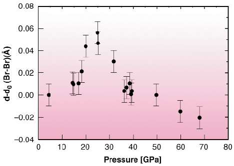 Fig. 106: Relative evolution of the molecular Br2 distance with pressure. The change of behaviour takes place at the metallisation pressure. |