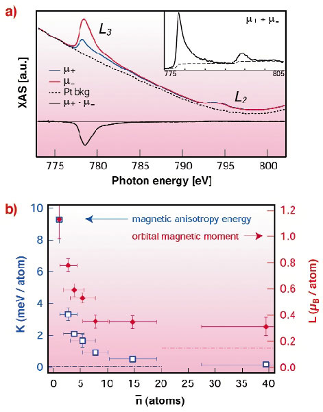 Magnetic materials play a key role in present-day technology and industry. In many instances their usefulness is determined by the magnetic anisotropy, i.e. by the extent to which the magnetisation retains or switches its orientation in response to thermal or magnetic stimuli. Owing to its importance, different sources of magnetic anisotropy have been investigated over the past 100 years. Studies on ferromagnetic bulk materials and thin films have highlighted the dependence of the magnetocrystalline anisotropy energy (MAE) on crystal symmetry and atomic composition [1]. While the exchange interaction among electron spins is purely isotropic, the orbital magnetisation, via the spin-orbit interaction, connects the spin magnetisation to the atomic structure of a magnetic material, hence giving rise to magnetic anisotropy [2]. Surface-supported nanoparticles offer additional degrees of freedom to tune the MAE by modifications of the particle size, shape, and coupling with the substrate. This makes nanosized systems attractive for basic investigations as well as for miniaturised data storage applications. To date, it is still unclear how anisotropic behaviour sets in and evolves in nanoscale particles. The key issues are the dependence of magnetic anisotropy on the details of the atomic coordination, its relation to the atomic magnetic moments, and the intrinsic upper limits to the MAE in a magnetic compound.