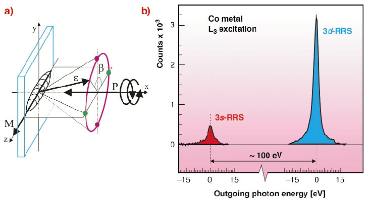 Fig. 114: a) schematics of the experiment. b) traditional RRS spectrum of Co metal. |