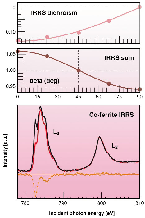 Figure 115 gives the IRRS spectra of Co in a ferrite measured in the green points of Figure 114 with opposite helicities together with the dichroism (orange). The angular dependence of the integrated dichroism (pink curve) and of the IRRS-sum signal (brown curve) can be used together with other scans based on small sample rotations around the y-axis (Figure 114). In this way, and by taking advantage of absorption measurements, one obtains information on moments up to order four as in the original reference.