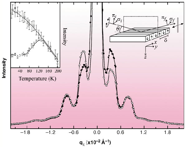 Fig. 119: SXRMS spectra measured at the Fe L3 edge using left (open circles) and right (solid circles) circularly-polarised light. The inset shows the intensity changes of the first- (open squares) and second-order (open circles) peaks as a function of temperature; the lines are guides to the eye. The experimental geometry is shown with the up and down arrows representing the stripe domains. |