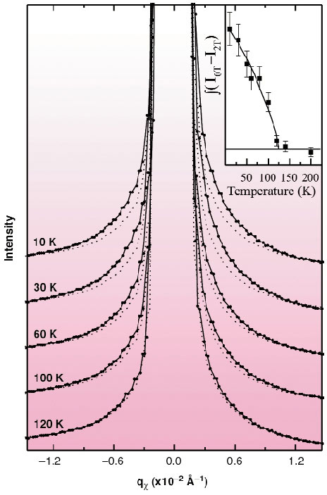 Fig. 120: Temperature dependence of the Ce SXRMS spectra (solid circles with lines). The SXRMS scattering recorded after the stripes have been destroyed in an applied magnetic field of 2T is also shown for each temperature (dashed lines). The inset shows the temperature dependence of the integrated difference between the spectra recorded with and without a 2T field and represents the temperature dependence of the Ce 4f perpendicular magnetic moment and magnetic anisotropy. |