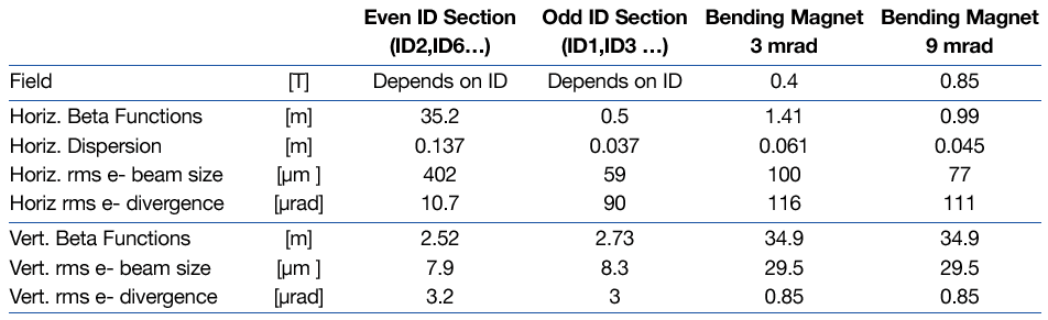 The following Table 4 gives the main optics functions, electron beam sizes and divergences at the various source points. For insertion device source points, the beta functions, dispersion, sizes and divergences are computed in the middle of the straight section. Two representative source points of bending magnet radiation have been selected, corresponding to an angle of observation of 3 mrad (9 mrad) from the exit, which corresponds to different magnetic fields. Electron beam profiles are Gaussian and the size and divergence are presented in terms of rms quantities. The associated full width half maximum sizes and divergences are 2.35 times larger. Horizontal electron beam sizes and divergences are given for the uniform filling modes and apply to almost all filling patterns except for the single bunch, for which a slightly larger size and divergence is attained due to the increased energy spread of the electron beam. Vertical electron beam sizes and divergences apply to the Uniform, 2x1/3 and Hybrid filling modes only. In order to increase the lifetime of the stored beam, the vertical beam sizes and divergences are increased by a typical 50% in 16 and single bunch filling patterns.