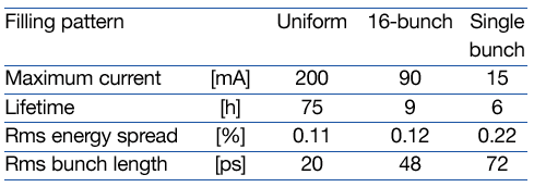 The lifetime, bunch length and energy spread depend to a large extent on the filling pattern. These are given in the following Table 5 for a few representative filling patterns. It should be noted that in both the 16 bunch and single bunch filling patterns the energy spread and bunch length decay with the current (the value indicated in the table corresponding to the maximum current). The bunch lengths are given for the usual RF accelerating voltage of 8 MV.