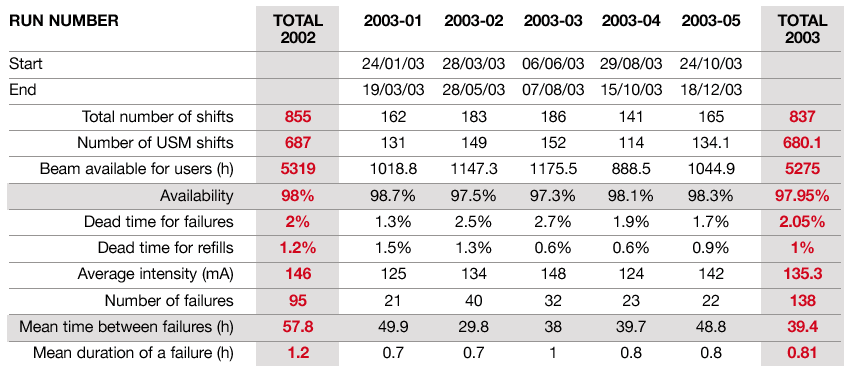 Table 6: Statistics of shifts, dead time, mean time between failures and beam availability in 2003. |