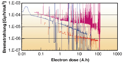 Fig. 177: The Bremsstrahlung measured on axis of three different NEG coated, 8 mm aperture ID chambers as a function of the integrated electron current. Each curve corresponds to a different chamber. |