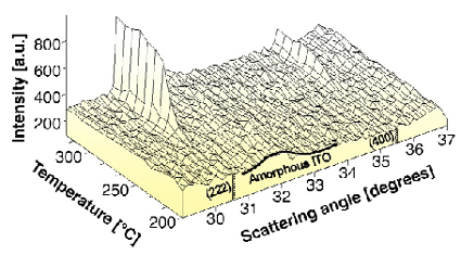 In summary, the structure and properties dependency on temperature of ITO films have been monitored in real time during annealing in vacuum, using three complementary in situ techniques. The direct observation of the structure yields a crystallisation temperature of 250°C. Even in the amorphous state the film resistivity decreases significantly at increasing temperature, probably due to relaxation of distorted In-O bonds, which leads to a free electron density enhancement by the creation of oxygen vacancies. The rapid crystallisation is accompanied by film roughening and leads to a further decrease of the resistivity due to Sn donor activation.