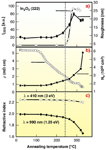 Fig. 31: The temperature dependence of the XRD integral intensity of the In2O3 (222) peak (I(222)) and the film roughness (a); resistivity and free electron density Ne (b); refractive index (c). |