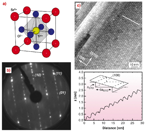 The STO(106) surface, which is vicinal to STO(001), exhibits an unusual morphology. In the low energy electron diffraction (LEED) image of STO(106) in Figure 90b, besides the integer order reflections, spots at n/6 in the [10]-direction are due to the step structure and their sharpness is indicative of a very smooth (106) surface. The scanning tunnelling microscopy (STM) image in Figure 90c shows a very regularly "terraced" surface with an astonishing degree of long-range order. On the shorter length-scale, many uncorrelated contrast variations indicate substantial short-range disorder. The cross section of the STM image reveals rounded step edges.