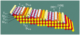 The structure of STO(106) was solved by diffraction measurements at beamline ID03 using X-rays of 20 keV energy. The surface was prepared in UHV by annealing only. Integrated intensities were recorded for 84 crystal truncation rods and the total number of non-equivalent reflections was 1644. From the widths of several reflections, the domain size was determined to be between 35 and 50 nm along the "step-edges", and close to 400 nm in the perpendicular direction, which represents a remarkable degree of long-range order. Utilising a "direct method", which has been developed for solving surface crystallographic problems [2], a starting model was obtained: a regularly stepped (106) surface with reduced site occupancies of the constituent atoms, varying as function of their proximity to the surface (Figure 91).