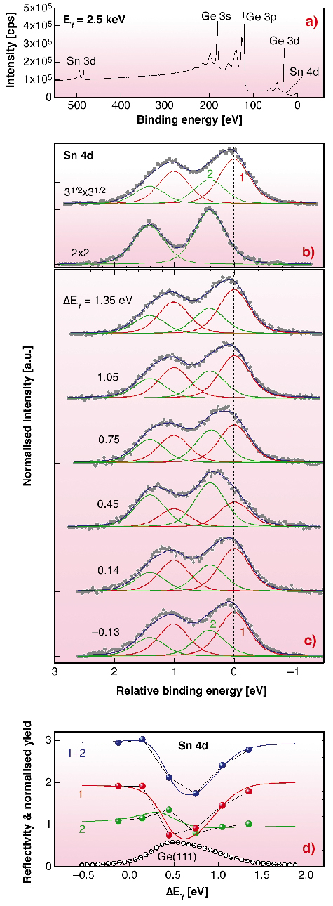 3 phase (Figure 100b) by measuring the photoelectrons excited by an X-ray standing wave (XSW) field. In addition to the high spatial resolution and chemical sensitivity, our approach also takes advantage of the fast process of photoemission in probing the equilibrium structures. Using this unique combination available at ID32 we succeeded in resolving simultaneously the core-level shift and the vertical split of the Sn positions. Our results provide clear evidence that directly links the chemical states of the adatoms with the structures.