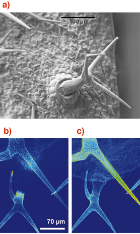 Fig. 131: (a) Scanning electron microscope image of "trichomes" from the plant Arabidopsis thaliana. (b) Fluorescence image showing the cadmium content. (c) Fluorescence image showing the calcium content. Images courtesy of M.-P. Isaure, B. Fayard, G. Sarret, S. Pairis, J. Bourguignon (Publication submitted to Environmental Science and Technology) |