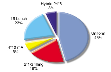 No significant changes in the distribution of the modes are to be noted for 2006 compared to the previous year. The multibunch modes remain dominant, making up 63% of the shifts. Figure 147 shows the distribution of the various filling modes in 2006.