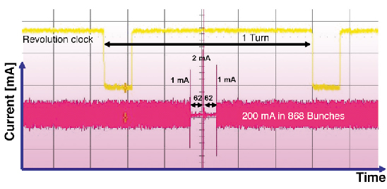 The increasing demand for time structure led to the development of a new multibunch filling pattern: the so-called “7/8 +1 filling mode”. The overall lifetime is in the order of 72 hours at 200 mA. The presence of a gap (1/8 of the circumference) avoids beam-ion instabilities, thus maintaining the vertical emittance at the lowest value, around 25 pm•rad. A single bunch of 2 mA, placed in the middle of the gap, is delivered with a contrast ratio of 10-9 between filled and unfilled bunches. To satisfy Users’ requests such as achieving a sharp contrast between the bunch trains and the nearly empty buckets, the first and the last bunch of the train are filled at 1 mA. Figure 148 presents the time structure of the beam around the ring circumference.