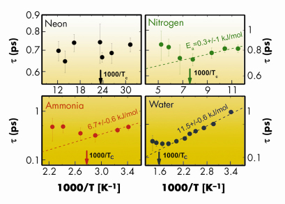 , with a strong (typically Arrhenius) temperature dependence resembling that of viscosity. Recent studies performed on hydrogen bonded (HB) systems suggest that the microscopic mechanism responsible for the structural relaxation is the making and breaking of the hydrogen bonded network, which occurs on the picosecond timescale [1]. The aim of the work presented here was to investigate how this relaxation is affected by the transition from the liquid to the supercritical state. In order to evidence any possible common phenomenology, four systems (neon, nitrogen, ammonia and water), characterised by different intermolecular interactions and intramolecular structures, were studied. The relaxation time was experimentally determined by analysing inelastic X-ray scattering spectra taken at beamlines ID16 and ID28 (further details on the data analysis are reported in [2]). The values obtained for