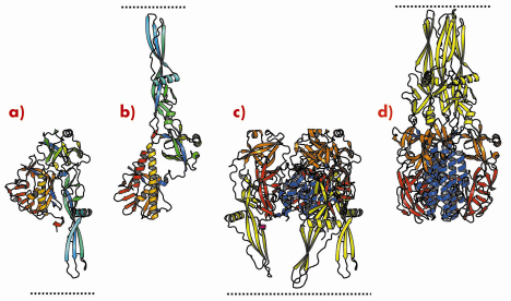 Fig. 67: Ribbon representation of the G protomer (a, b) and trimer (c, d) in both prefusion (a, c) and postfusion (b, d) conformations. Protomers are coloured by residue number in a gradient from blue (N terminus) to red (C terminus). Trimers are coloured by domain (lateral domain: red, trimerisation domain: blue, pleckstrin homology domain: orange, fusion domain: yellow) with the C-terminus in magenta. Pre- and post-fusion forms are superimposed on the rigid blocks made of the lateral domain and the invariant part of the trimerisation domain. The lipid bilayer, in which the transmembrane domains are anchored, is indicated by the dotted line. |