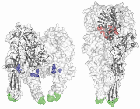 Furthermore, we have previously identified acidic amino acid residues that are brought together in the central six helix bundle in the post-fusion (low pH) state [3]. In this conformation, they are protonated and participate in hydrogen bonds. The deprotonation of these residues at higher pH will induce strong repulsive forces that destabilise the trimer and initiate the conformational change back to the prefusion state (in which these residues are solvent exposed). Conversely, the prefusion structure revealed a conserved cluster of three histidines that could play the role of a pH sensitive molecular switch. Indeed, low pH–induced protonation of these residues leads to a cluster of positive charges that might trigger the movement of the fusion domain toward the target membrane (Figure 68).