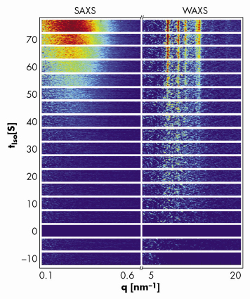Fig. 57: Azimuthal sectors of SAXS and WAXS patterns recorded simultaneously following a rapid temperature quench to the crystallisation temperature of 145°C (tIso evolves after the sample reached the isothermal condition). The diffraction from crystalline (WAXS) nuclei is evident prior to significant evolution of SAXS. From each frame the melt background (tIso=0) has been subtracted. |