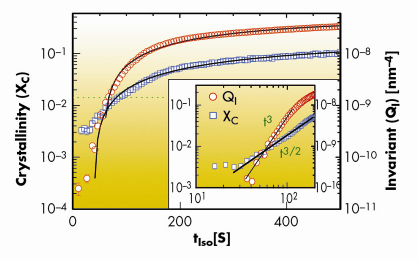 Figure 58 presents the evolution of the scattering invariant (QI) and crystallinity (XC) calculated from the normalised SAXS and WAXS intensities, respectively. Qualitatively, both quantities follow an exponential type growth, identical to the Avrami function conventionally used to describe crystallisation kinetics. However, an important feature in Figure 58 is that the initial growths of XC and QI significantly deviate from the Avrami behaviour as shown in the inset. The unprecedented sensitivity allowed us to detect the initial level of XC, which appeared as broad peaks in the WAXS pattern prior to the onset of significant evolution of SAXS intensity. This plateau in crystallinity could be originating from the so-called baby nuclei observed in computer simulations [2]. In this metastable state, only the most favourable nuclei survive while nascent nuclei appear spontaneously resulting in a constant level of crystallinity (tIso< 30 s). The semi-crystalline lamellar morphology is destined at the following stage. As depicted in the inset of Figure 58, XC and QI follow power-law type growths, tIso3/2 and tIso3, respectively. For constant thickness of lamellae, XC