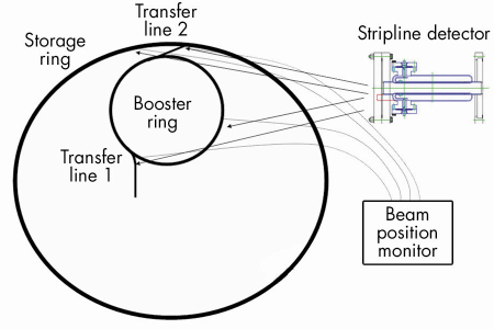 Fig. 146: Schematic diagram of the new injection efficiency measurement system. FPGA based electronics monitor the current in the various parts of the accelerator complex by means of high sensitivity stripline chambers. The signals are demodulated at 352 MHz and processed in real time to provide current, charge and transfer efficiency measurements to the operator in the control room. |