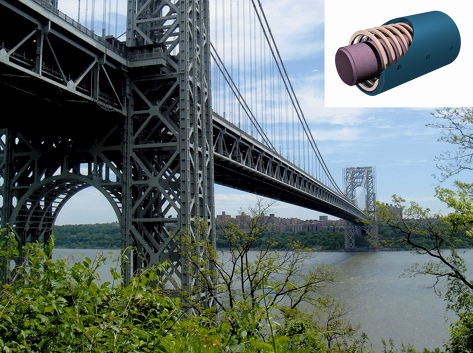 Fig. 112: In a typical magnetostrictive actuator, a magnetostrictive material (central rod) is wrapped in a metal coil, which is in turn housed in an outer casing. By passing a current through the coil, a magnetic field is formed within in, causing the rod to extend. Alternatively, the device may operate in reverse as a sensor, where external pressures change the length of the rod, which in turn generates a magnetic field that induces a measurable current in the coil. Such sensors are frequently employed for non-destructive testing applications, such as examination of suspender cables on bridges. |