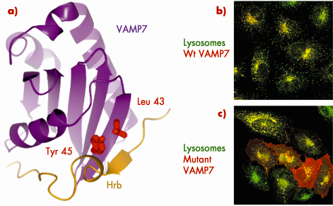 Fig. 81: a) Structure of the VAMP7 (purple): Hrb (gold) complex with key residues, whose mutation abolishes the interaction between the two proteins in vitro, highlighted in red. b) tagged VAMP7 (red) can be internalised from the cell surface to lysosomes and late endosomes (green) resulting in complete overlap of the two as indicated by the resulting yellow punctae. c) A version of VAMP7 harbouring mutations in the key VAMP7 residues Leucine43 and Tyrosine45 (red) cannot bind to Hrb and so cannot be internalised and builds up on the cell surface. |
